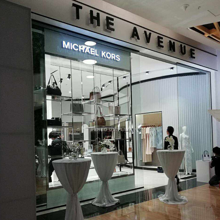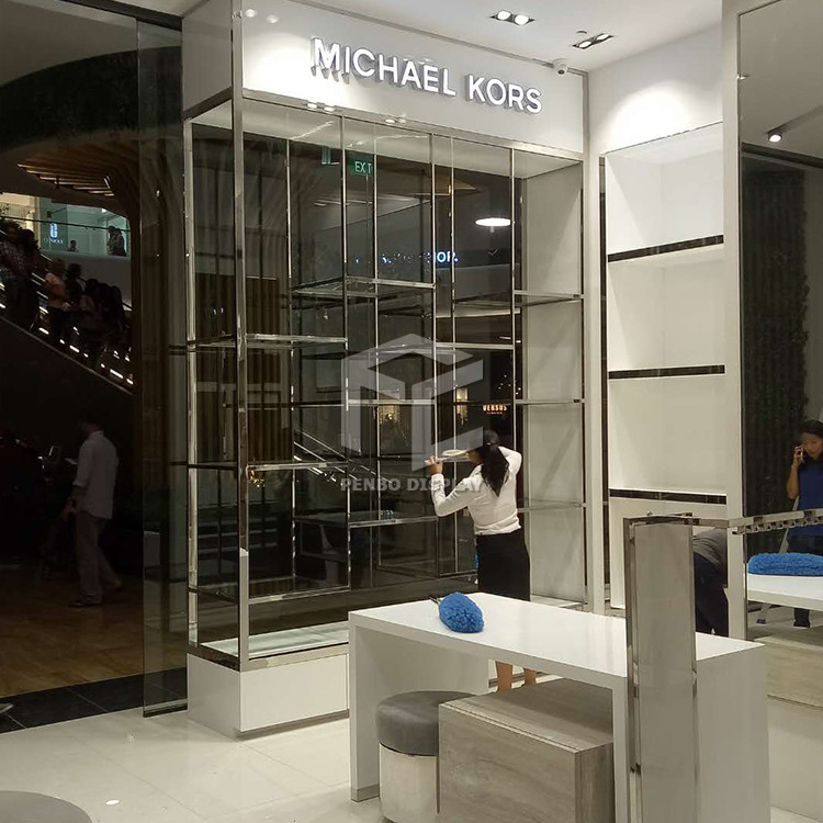 Michael Kors, glaube ich, dass jeder kein Fremder zu dieser Marke ist. Ja haben wir mit ihnen gearbeitet, um Ausstellungsstände für sie zu machen. Die Hauptmaterialien sind Edelstahl und MDF mit Malerei